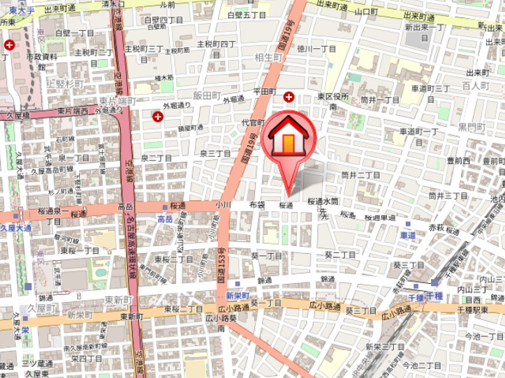 | 交通 | 名古屋市営桜通線/車道駅 徒歩6分 名古屋市営桜通線/高岳駅 徒歩9分 名古屋市営東山線/新栄町駅 徒歩9分 |